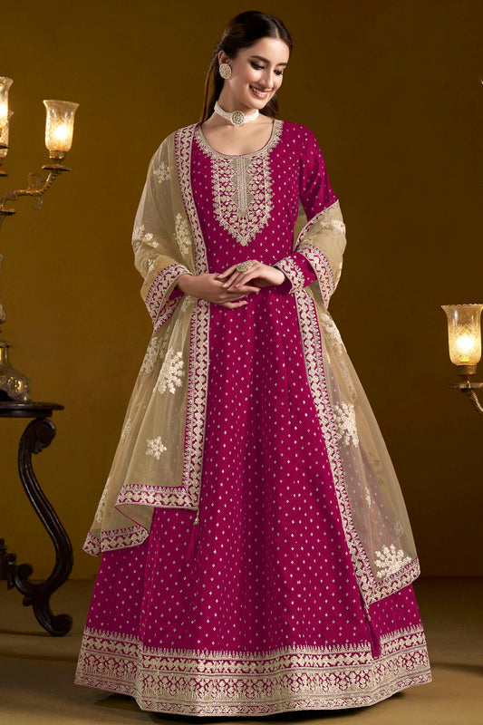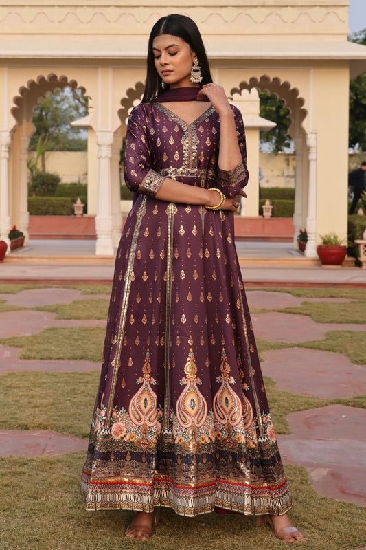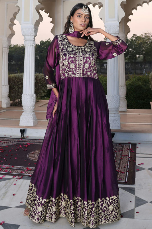 Wine Colour Semi Stitched Chinon Silk Anarkali Suit VSSM1170038