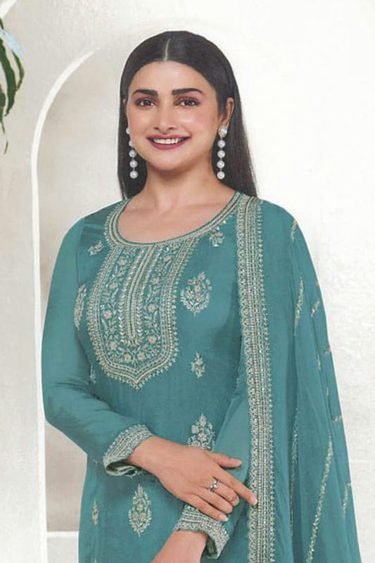 Teal Colour Organza Silk Pant Style Suit VSSM1140093