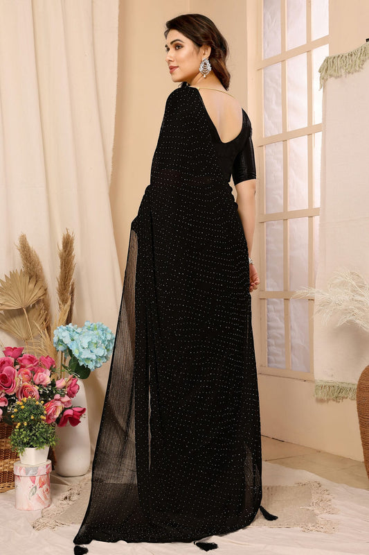 Black Colour Satin Chiffon Stone Work Saree VSSD1180083