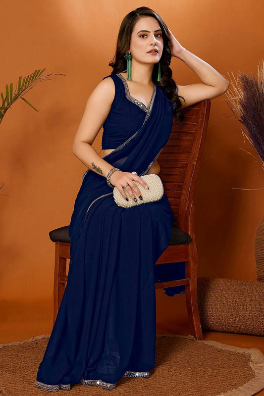 Navy Blue Colour Georgette Mirror Work Saree VSSD1180221