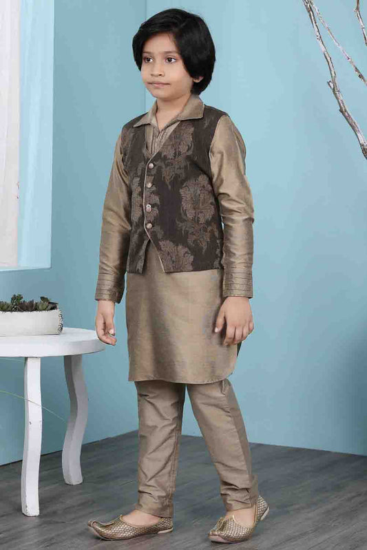 Beige and Brown Colour Cotton Silk Kurta Pajama With Jacket VSBW1070107