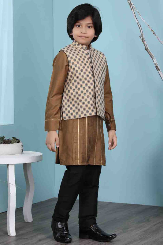 Brown and Black Colour Cotton Silk Kurta Pajama With Jacket VSBW1070104