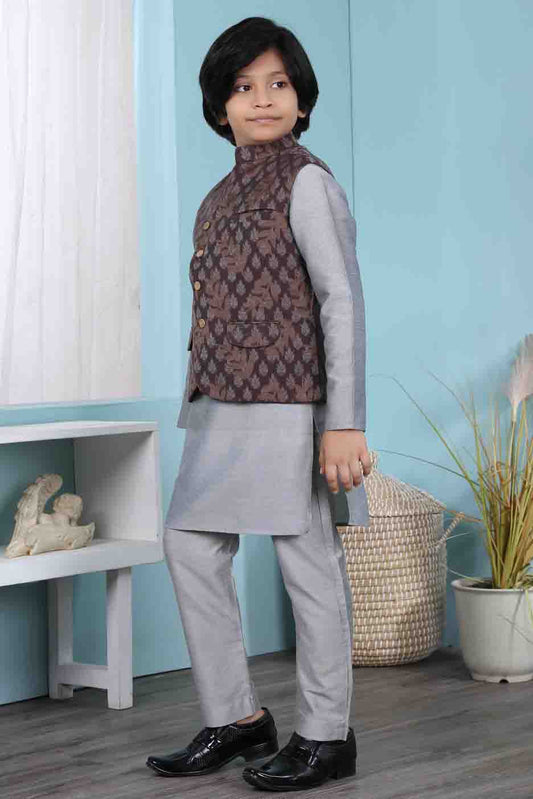 Grey and Brown Colour Cotton Silk Kurta Pajama With Jacket VSBW1070108