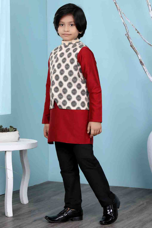 Red and Beige Colour Cotton Silk Kurta Pajama With Jacket VSBW1070103