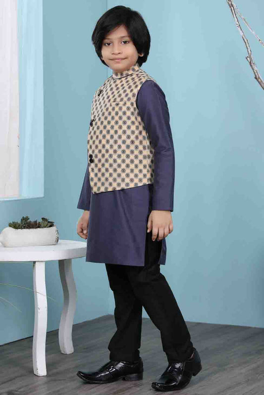 Navy Blue and Beige Colour Cotton Silk Kurta Pajama With Jacket VSBW1070112