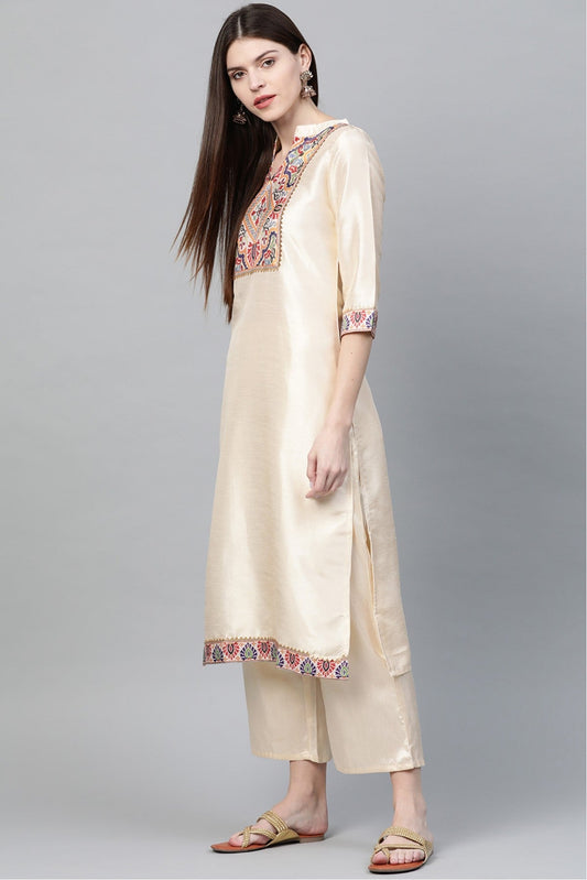Cream Colour Plus Size Poly Silk Straight Kurta Palazzo Set VSKR1060013