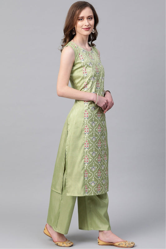Light Green Colour Plus Size Poly Silk Straight Kurta Palazzo Set VSKR1060012