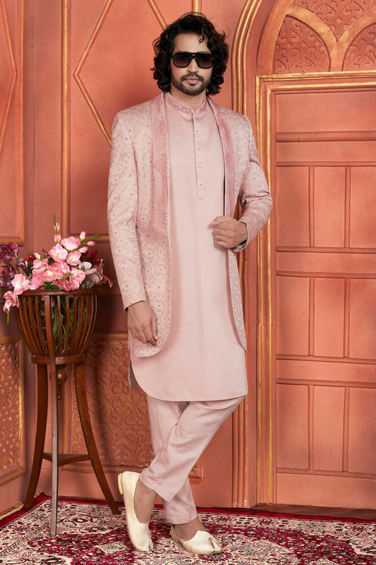 Peach Colour Art Silk Indowestern Sherwani With Aligadhi Pant VSSH1230001