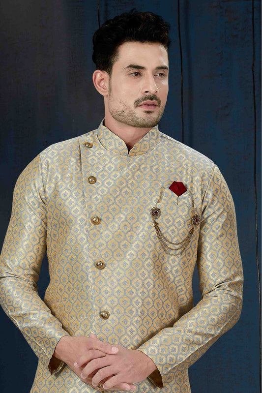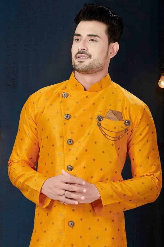 Mustard Colour Jacquard Party Wear Indo Western Sherwani VSSH1040226