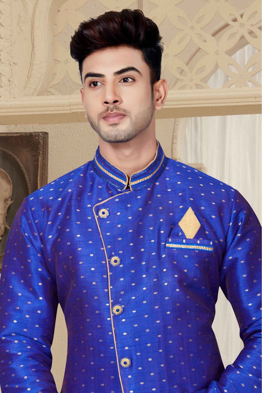 Blue and Yellow Colour Jacquard Party Wear Sherwani VSSH1040237