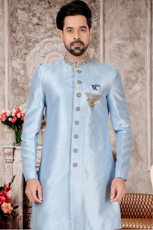 Sky Blue Colour Slub Silk Sherwani VSSH1040309