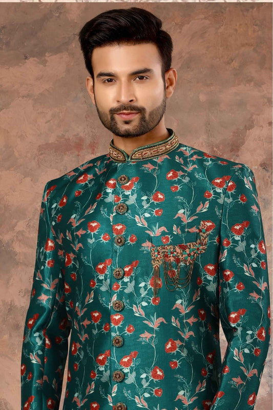 Green Colour Jacquard Digital Print Sherwani VSSH1040329