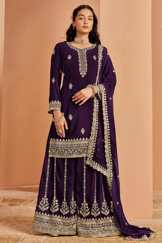 Purple Colour Semi Stitched Chinon Palazzo Pant Suit VSSM1140666