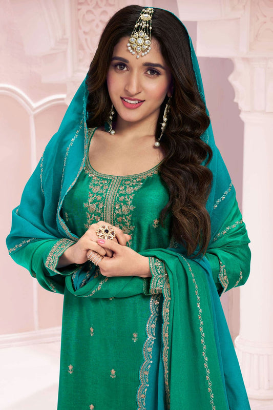 Rama Green Colour Semi Stitched Vichitra Silk Palazzo Pant Suit VSSM1140497
