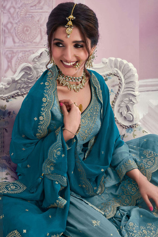 Teal Colour Chinon Silk Palazzo Pant Suit VSSM1140536