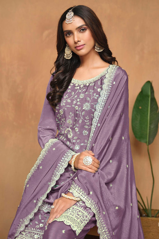 Purple Colour Semi Stitched Chinon Palazzo Pant Suit VSSM1140245