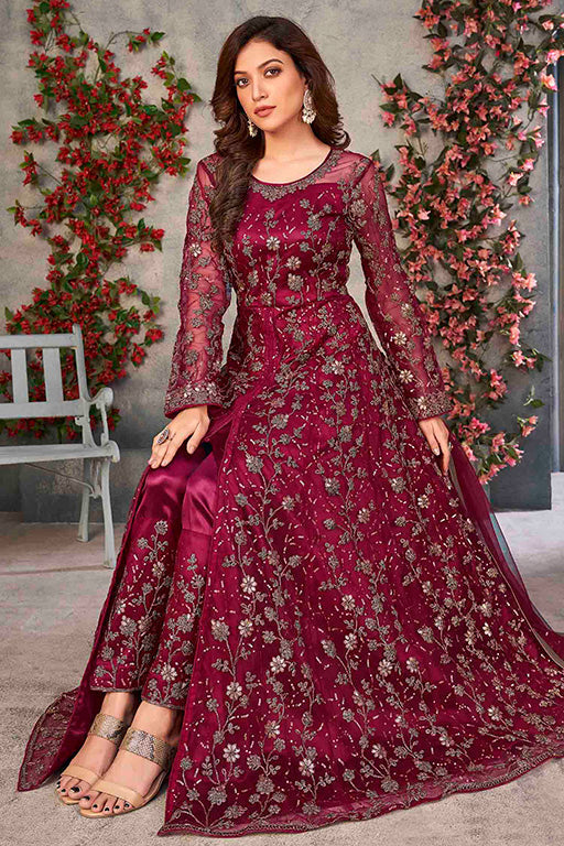 Maroon Colour Net Pant Style Suit VSSM1050050