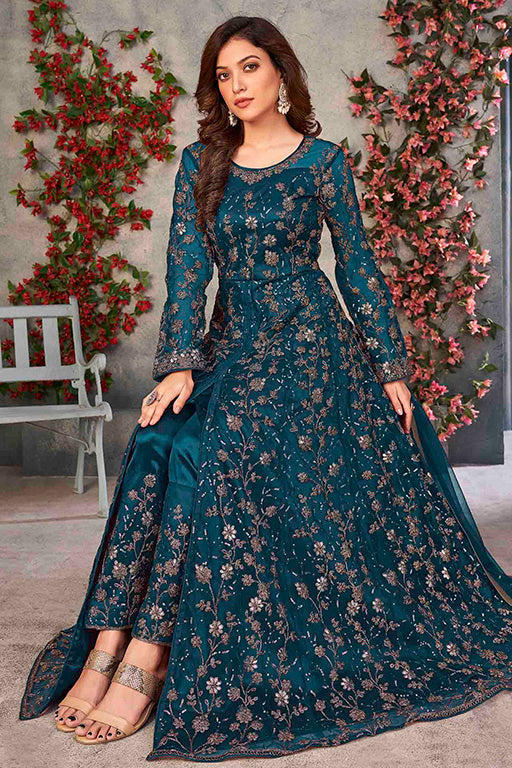 Teal Colour Net Pant Style Suit VSSM1050144