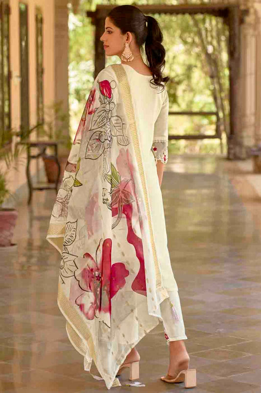 White Colour Viscose Roman Silk Embroidery Pant Style Suit VSSS1113656
