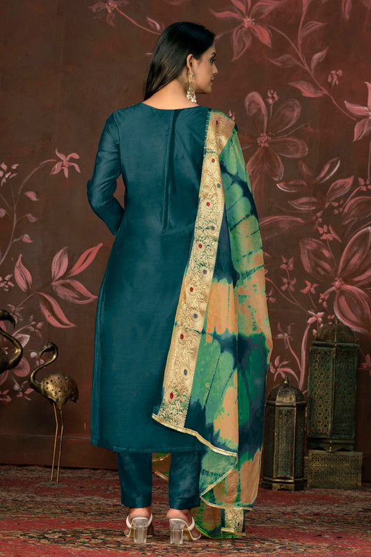 Slate Blue Colour Unstitched Pure Organza Pant Style Suit VSUS1161352