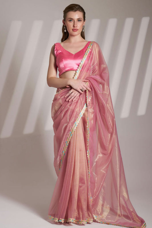 Pink and Gold Colour Twill Net Saree VSSD1112737