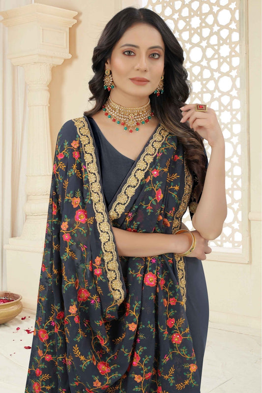 Grey Colour Georgette Embroidery Saree VSSD1120967
