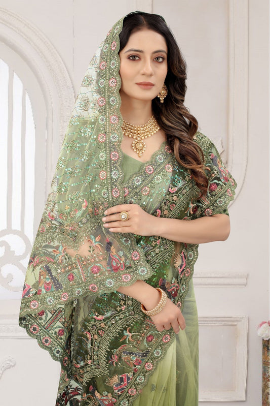 Mehendi and Green Colour Net Embroidery Saree VSSD1120888
