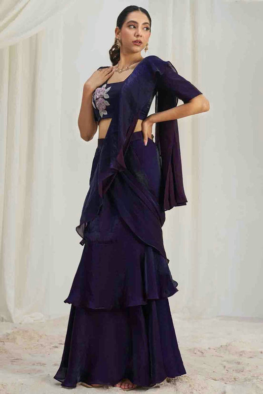 Navy Blue Organza Hand Work Ready To Wear Saree VSSD1080974