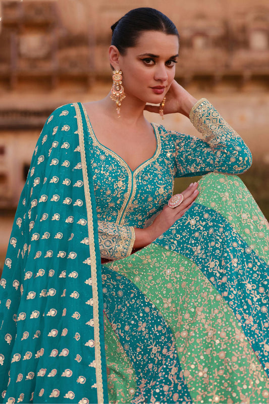Sea Green and Sky Blue Colour Gerogette Semi Stitched Anarkali Suit VSSM1140450