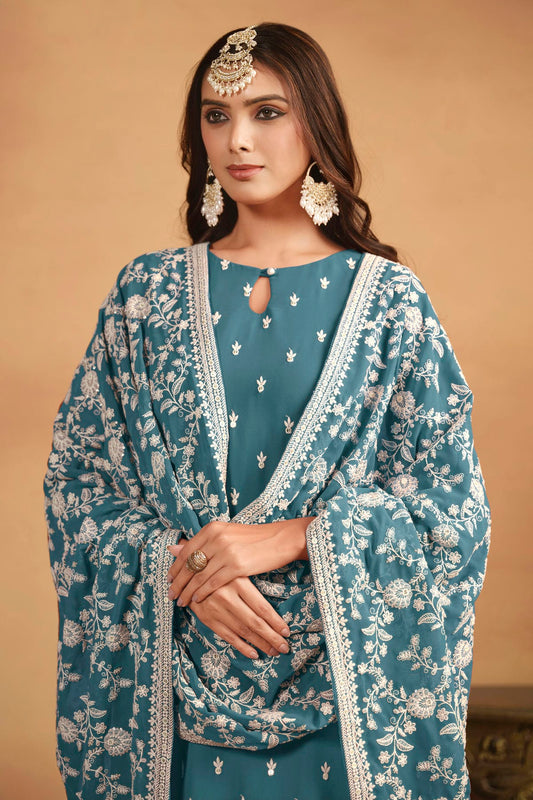 Teal Colour Straight Suit Chinon Silk Semi Stitched VSSM1050493