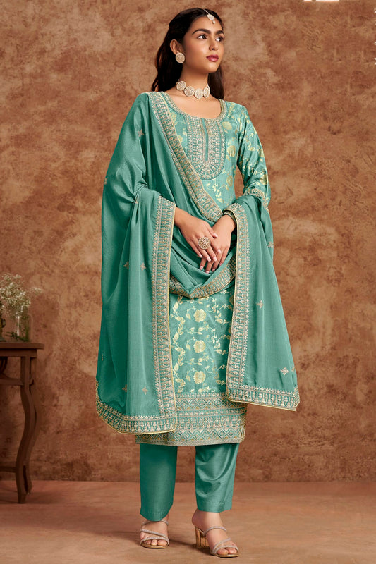 Sea Green Colour Dolla Silk Jacquard Straight Suit VSSM1050683