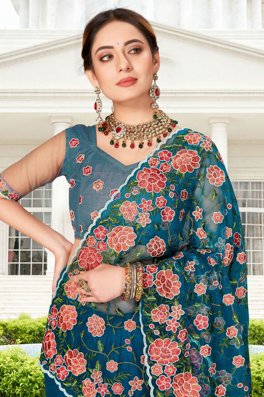 Teal Colour Net Saree VSSD1090761