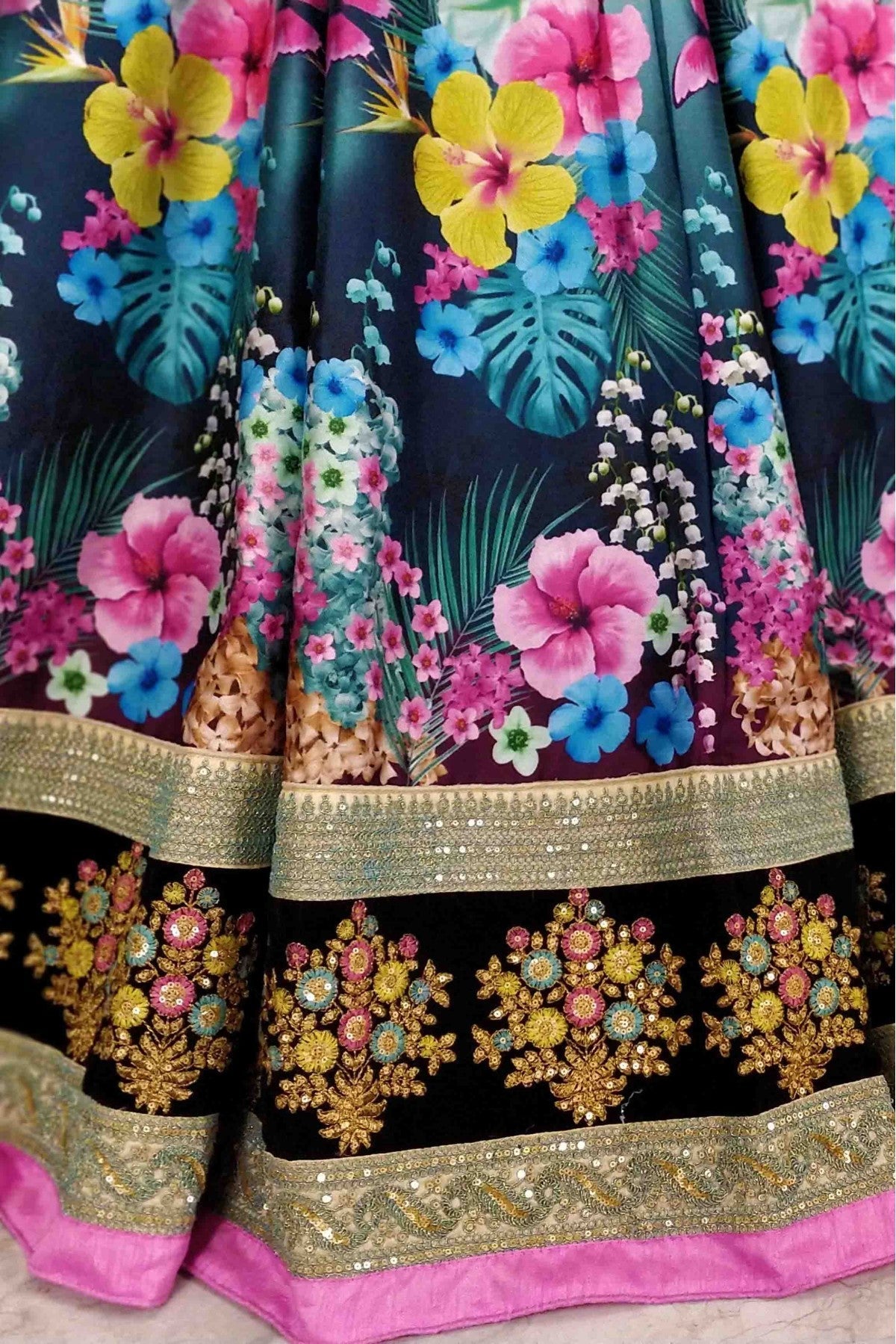 Sky Blue And Black Colour Art Silk A Line Lehenga Choli Comes With Matching Silk,Velvet Blouse Fabric. This Lehenga Choli Is Crafted With Digital Print,Embroidery,Zari Work,Sequins Work,Thread Work. This Lehenga Choli Is Semi Stitched And Blouse Comes As A Unstitched Which Can Be Stitched Up To Size 42.