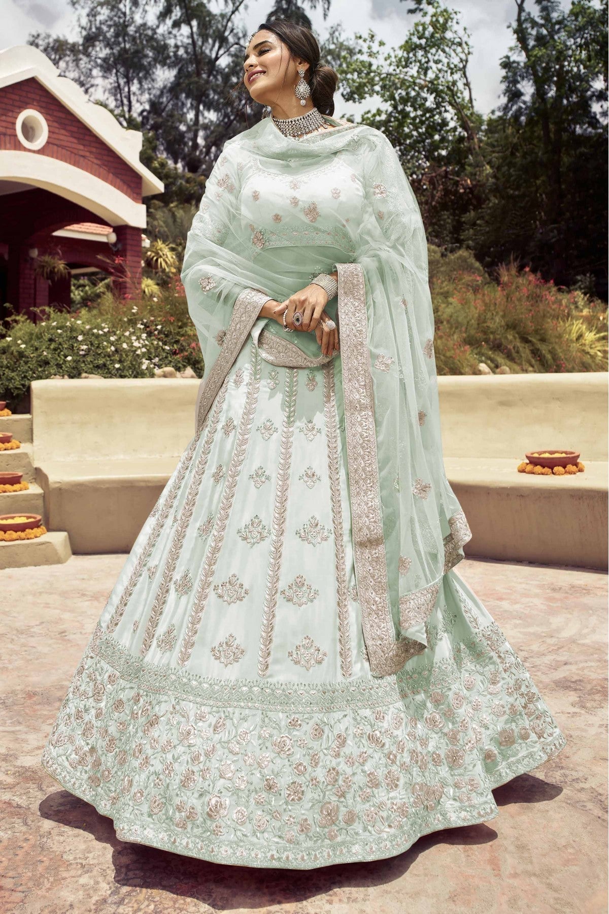 Light Blue Colour Crepe Fabric Party Wear Lehenga Choli Comes With Matching Blouse. This Lehenga Choli Is Crafted With Resham Work,Foil Print,Stone Work. This Lehenga Choli Comes With Unstitched Blouse Which Can Be Stitched Up To Size 42.