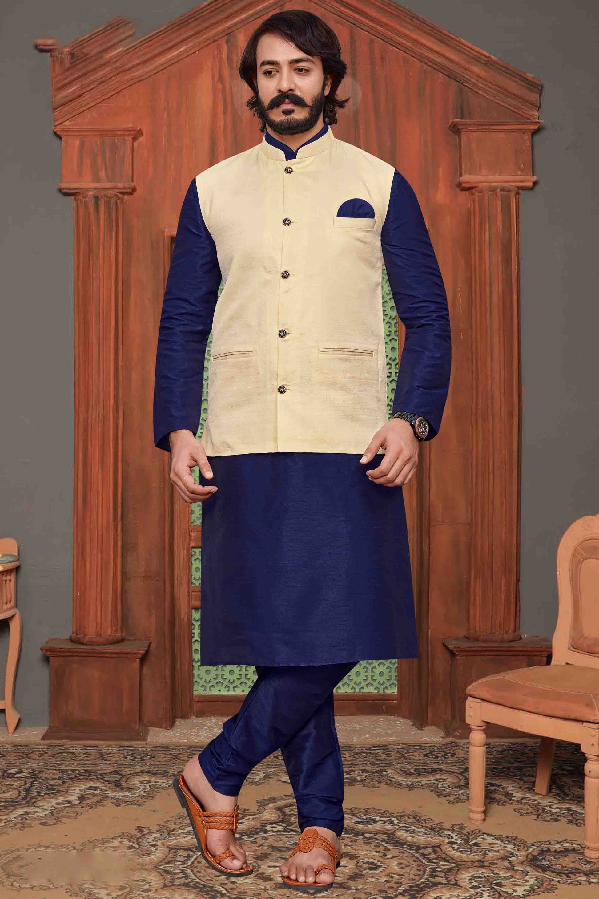 This Art Silk Kurta Pajama With Jacket In Blue Colour is a great way to show off your style and comfort. You can feel relaxed by wearing it at any function.