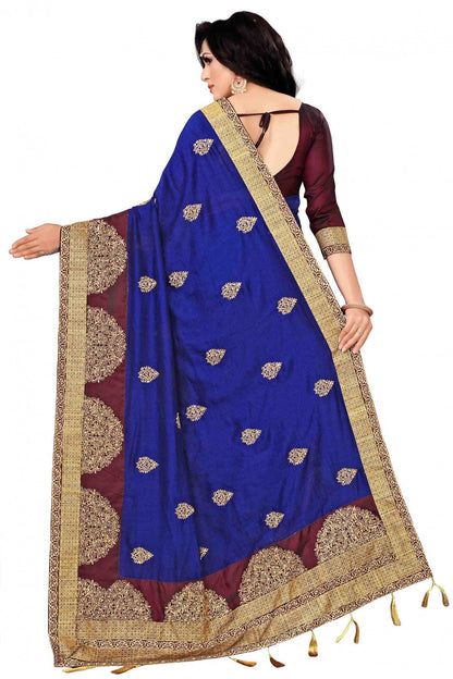 Blue Colour Vichitra Silk Saree Comes With Matching Taffeta Silk Blouse Fabric. This Saree Is Crafted With Embroidery,Stone Work. This Saree Comes With Unstitched Blouse Which Can Be Stitched Up To Size 42.