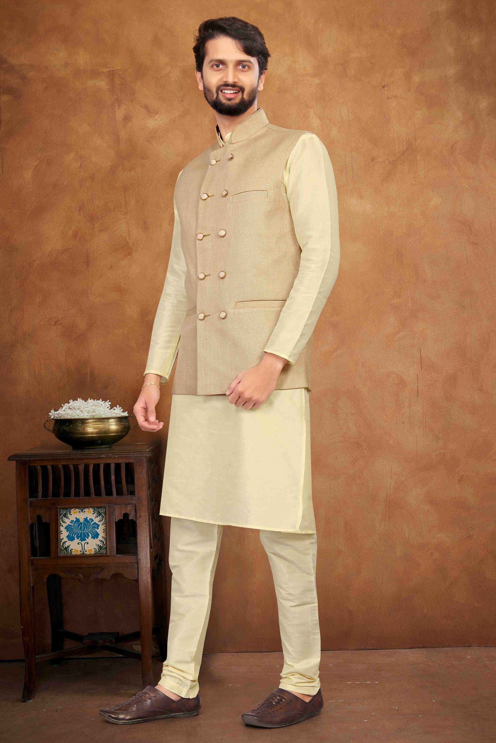 This Silk Kurta Pajama With Jacket In Cream Colour is a great way to show off your style and comfort. You can feel relaxed by wearing it at any function.