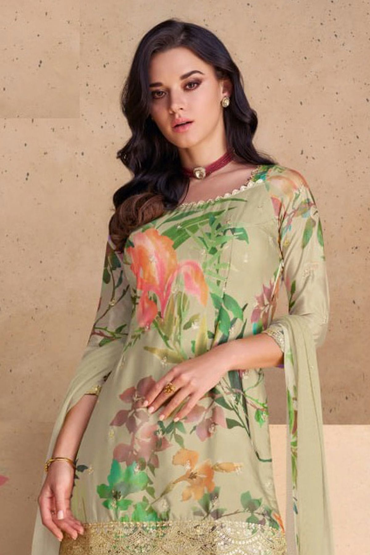 Cream Colour Semi Stitched Chinon Palazzo Pant Suit VSSM1140235