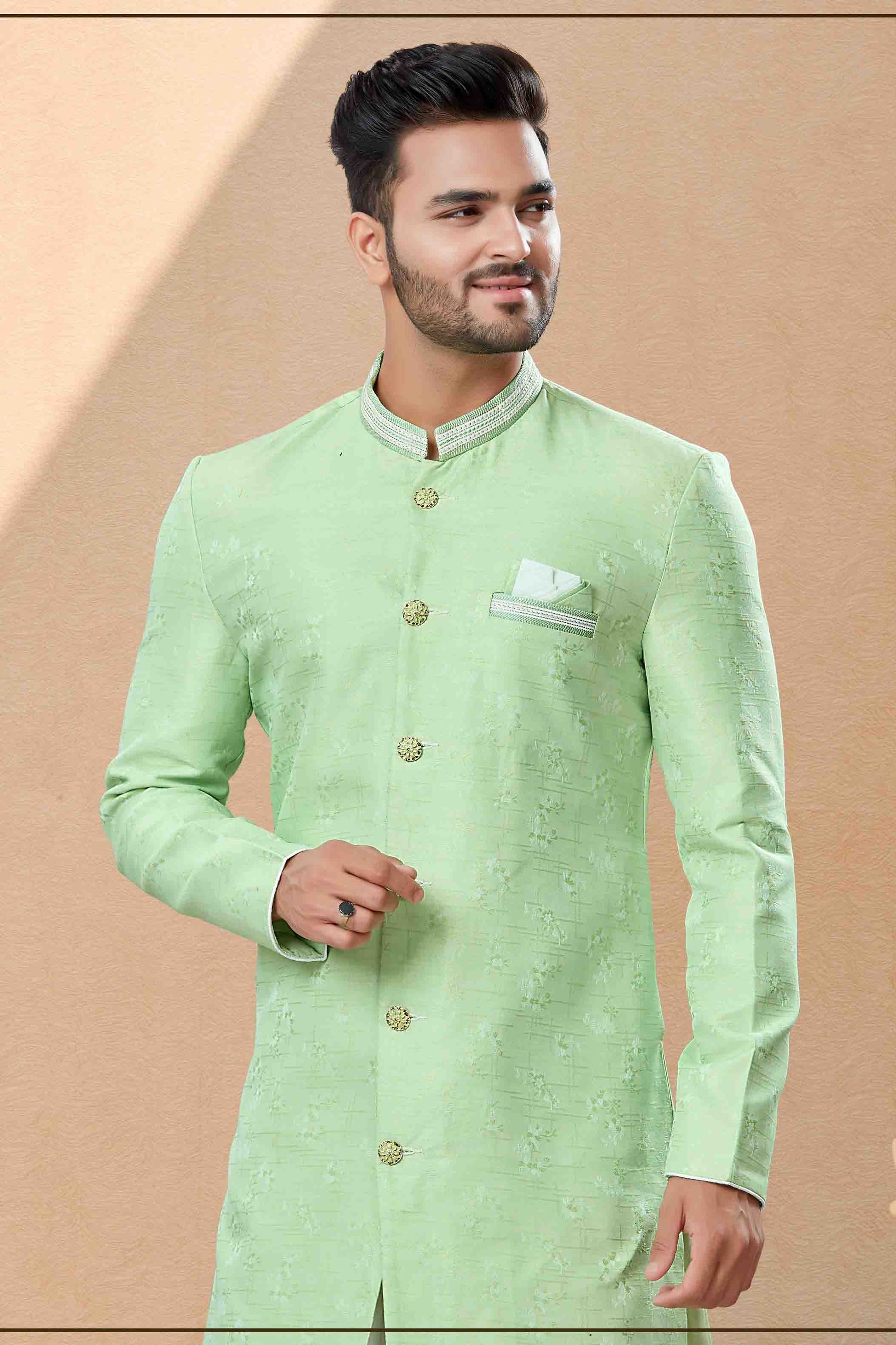 This Banarasi Jacquard Dhoti Sherwani In Green Colour is a great way to show off your style and comfort. You can feel relaxed by wearing it at any function.