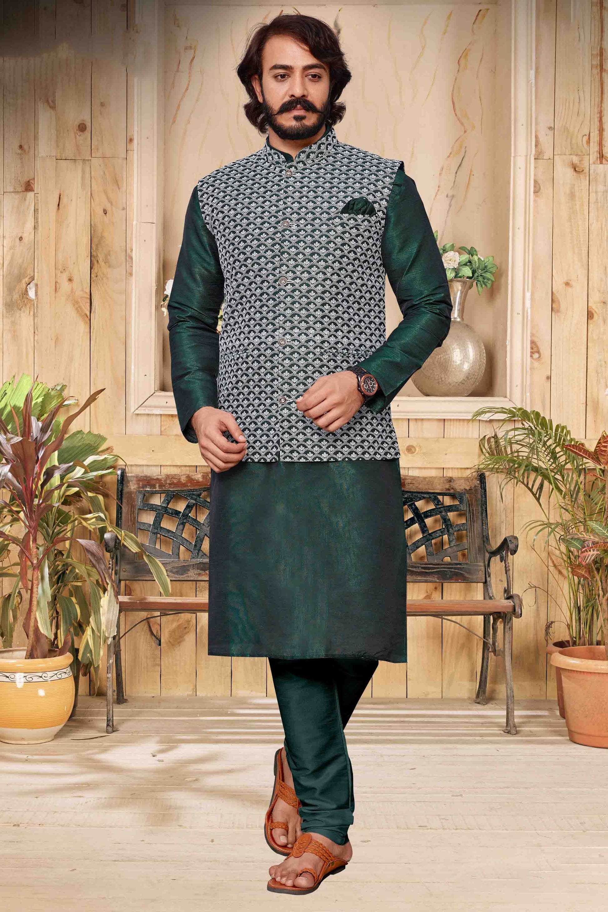 This Art Silk Kurta Pajama With Jacket In Green Colour is a great way to show off your style and comfort. You can feel relaxed by wearing it at any function.