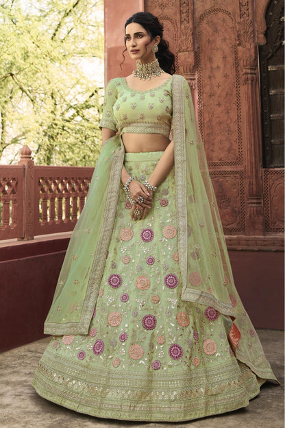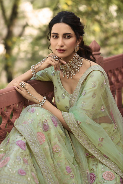 Pista Green Colour Organza Fabric Party Wear Lehenga Choli Comes With Matching Blouse. This Lehenga Choli Is Crafted With Embroidery,Thread Work,Zari Work. This Lehenga Choli Comes With Unstitched Blouse Which Can Be Stitched Up To Size 42.