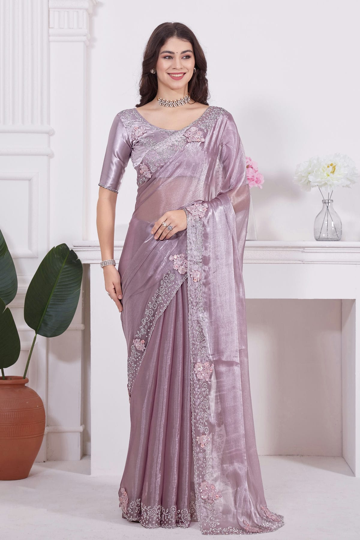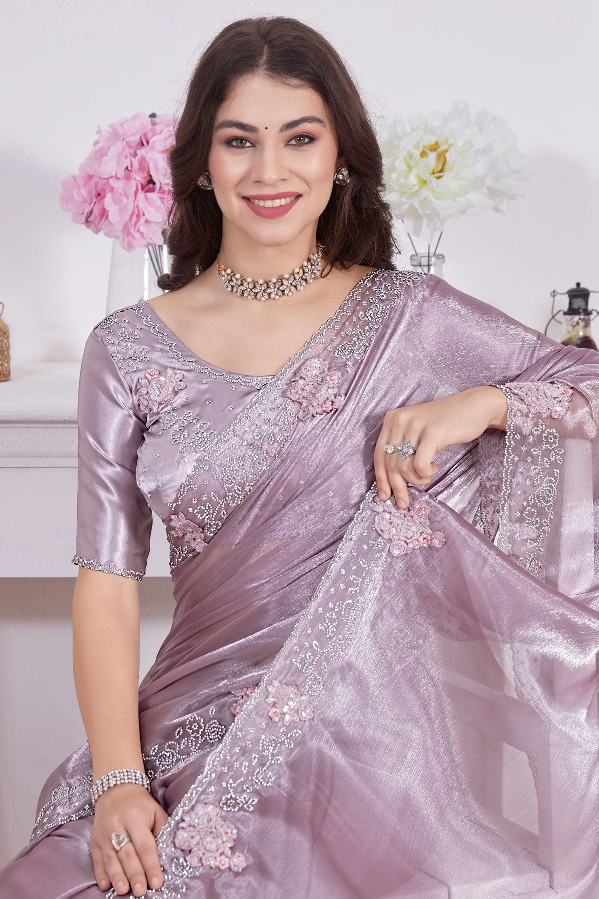 A Stylish Lavender Colour Burberry Silk Fabric Sequins Work,Embroidery,Patch Work Work Saree This Is An Absolute Designer Saree Designed For Every Occasion and Can Grace Any Body Type. The Stylish Lavender Saree Is Partnered With An Alluring Blouse Which Can Be Stitched Up To Size 42.