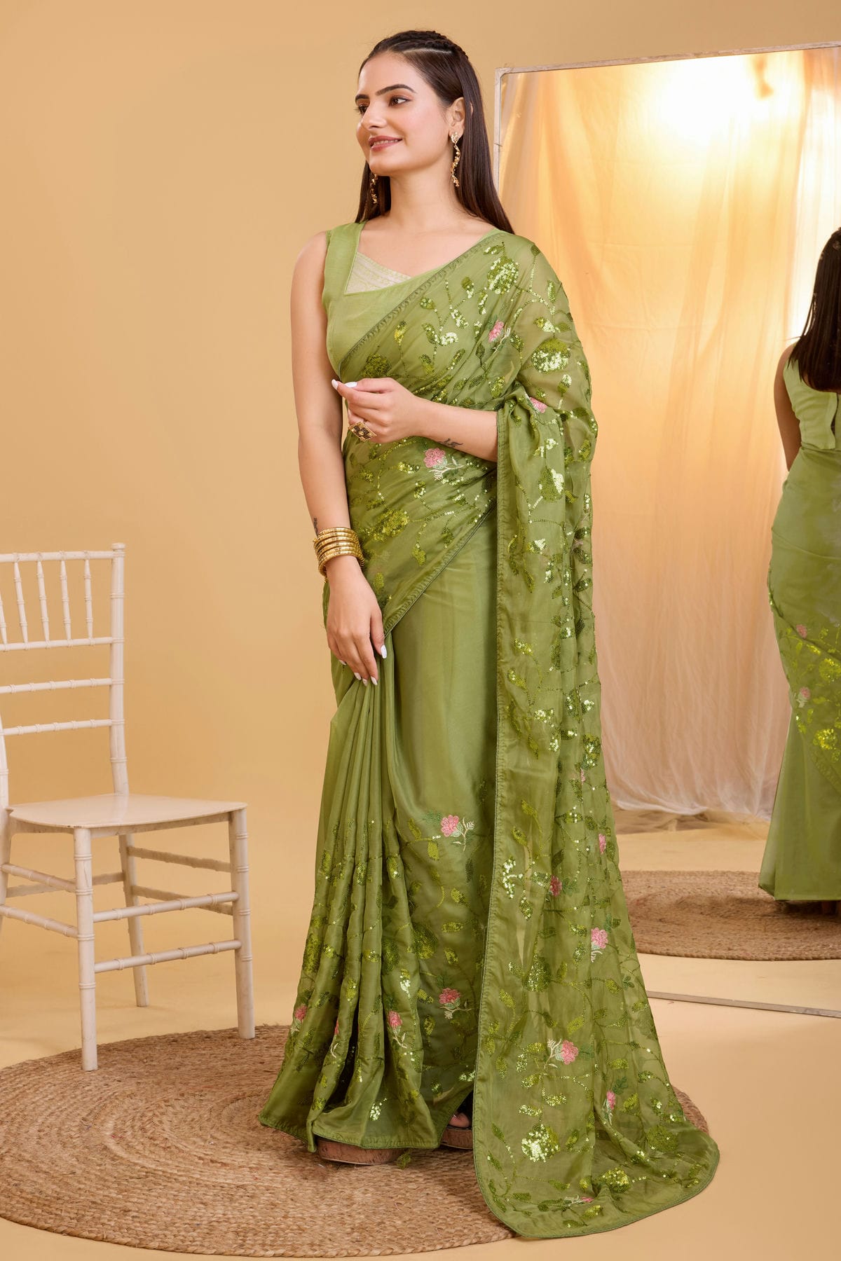 This Organza Saree In Mehendi Green Colour is a great way to show off your style and comfort. You can feel relaxed by wearing it at any function.