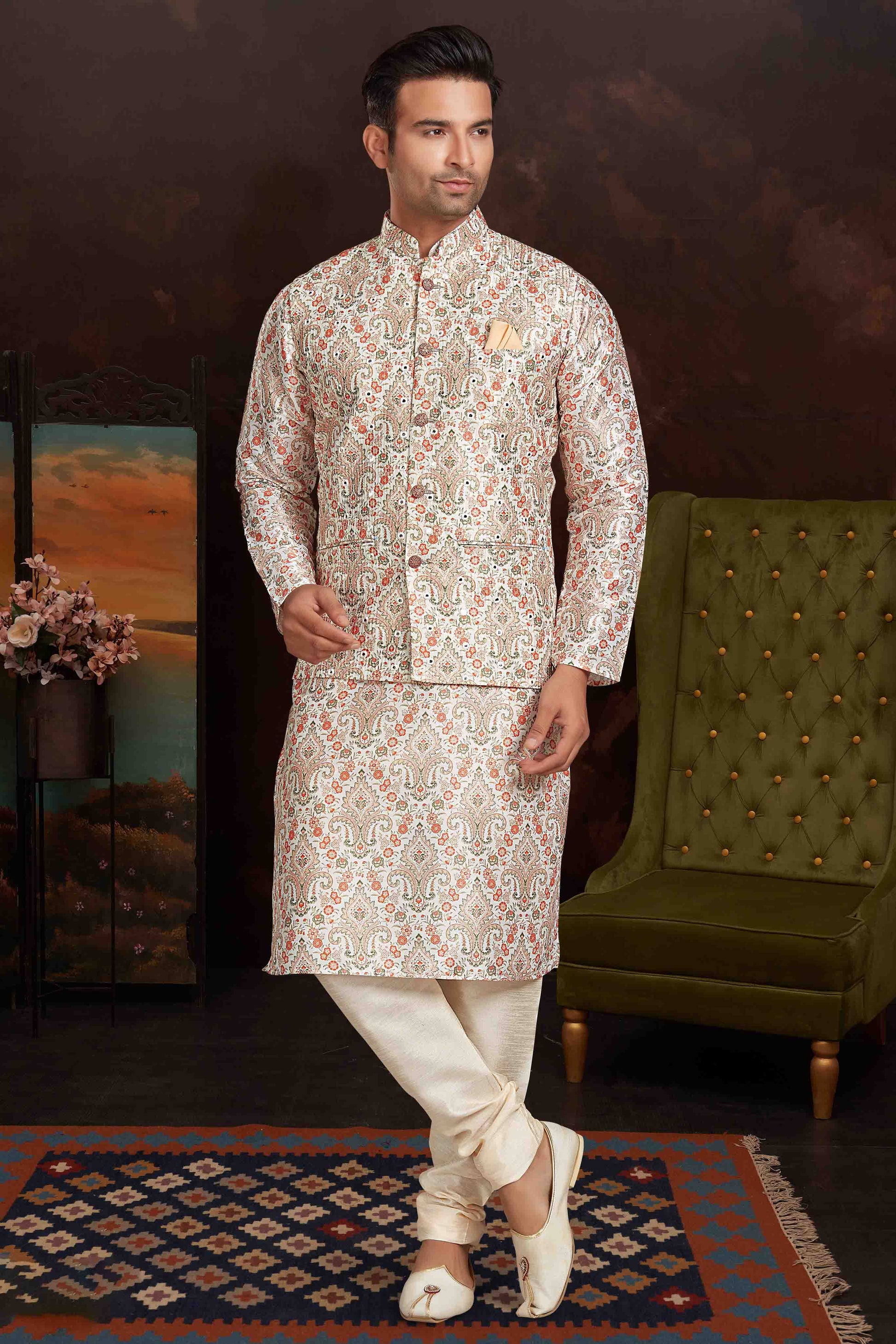 Multicolour Kurta Pajama With Jacket In Malai Silk VSKP1210434