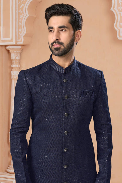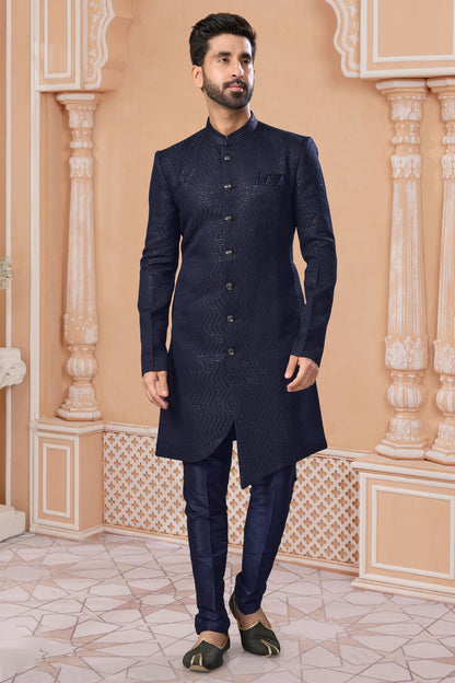 Navy Blue Colour Jacquard Sherwani VSSH1040552
