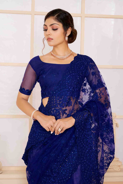 This Super Stylish Net Fabric Saree Is Exclusively Crafted With Resham Work,Embroidery,Moti Work,Stone Work. The Navy Blue Colour Saree Comes With Matching Blouse Fabric. This Saree Can Be Worn on Party Wear Occasion and Can Grace Any Body Type.Blouse Come as Unstitched Which Can Be Stitched Up to Size 42 inches.
