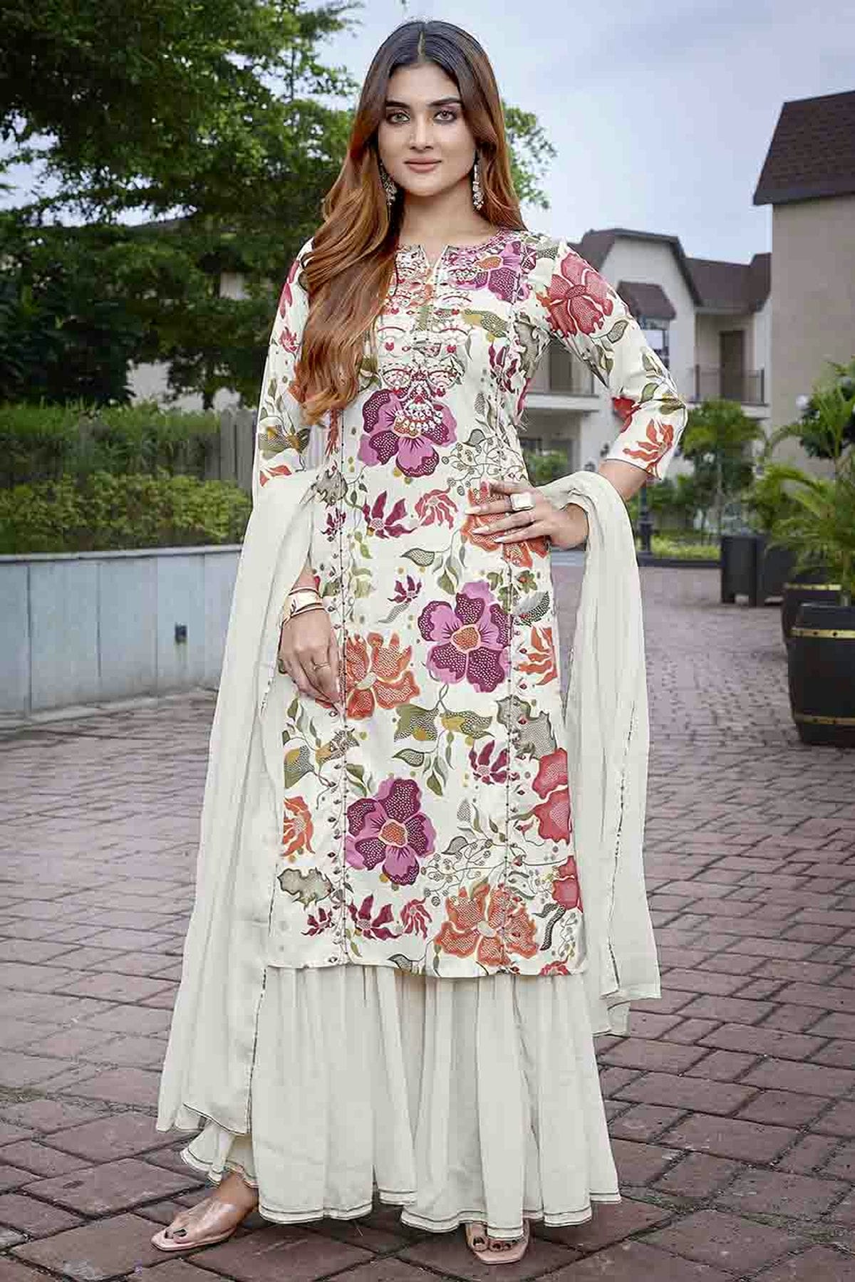 Off White Colour Viscose Printed and Embroidery Sharara Suit VSSS1113663