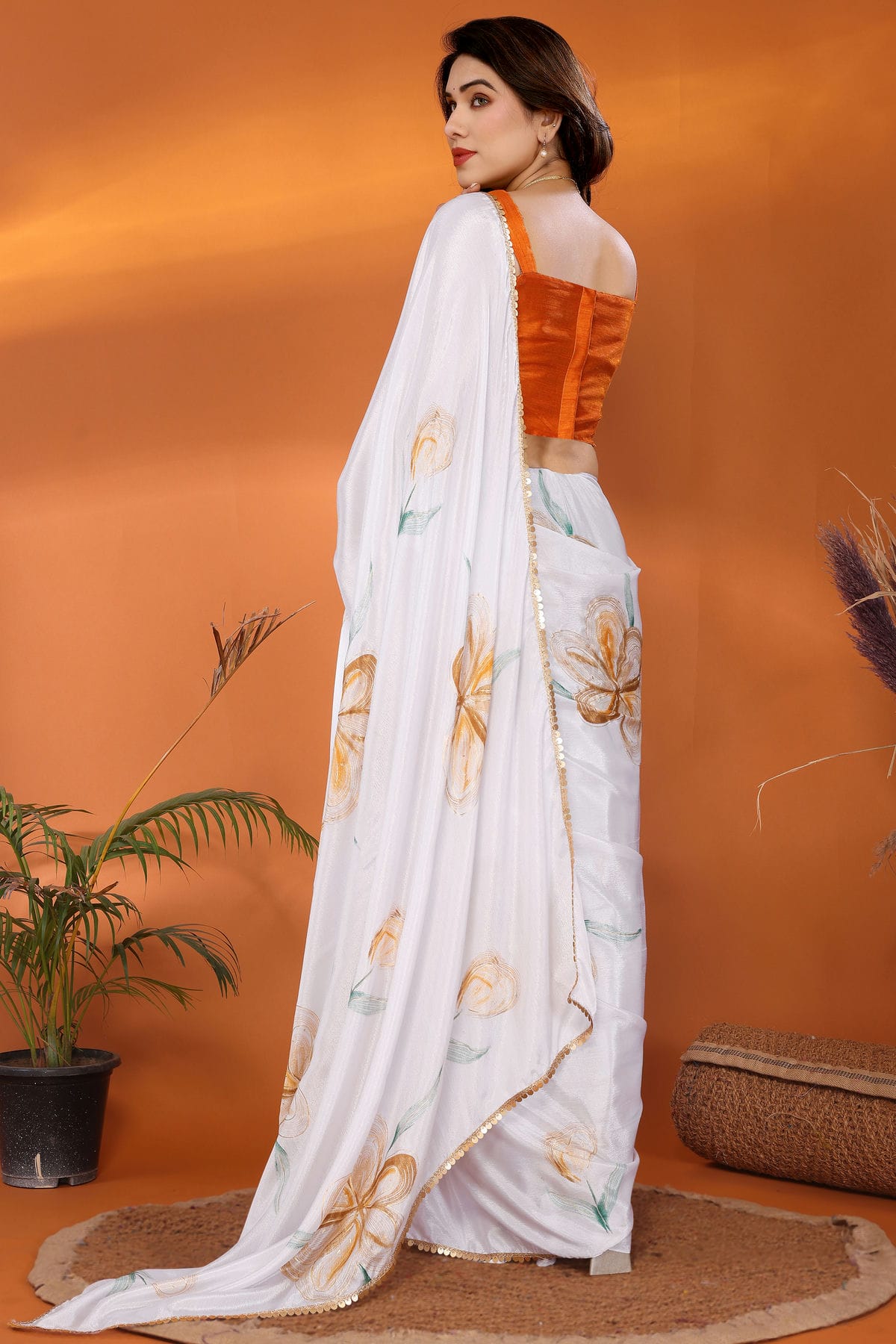 This Chinon Chiffon Printed Saree In Orange and White Colour is a great way to show off your style and comfort. You can feel relaxed by wearing it at any function.