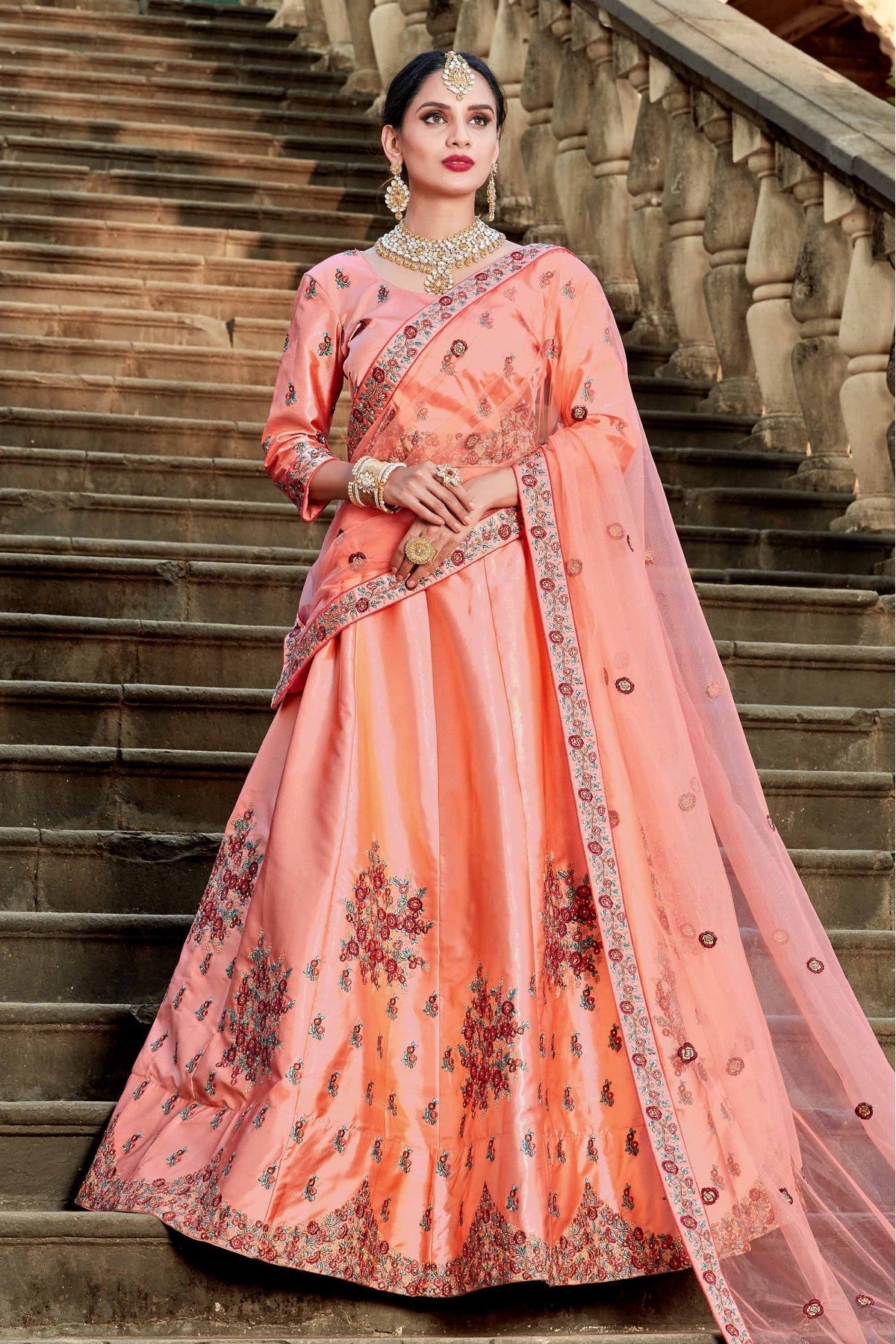 Peach Colour Pure Satin Fabric Party Wear Lehenga Choli Comes With Matching Blouse. This Lehenga Choli Is Crafted With Resham Work. This Lehenga Choli Comes With Unstitched Blouse Which Can Be Stitched Up To Size 42.