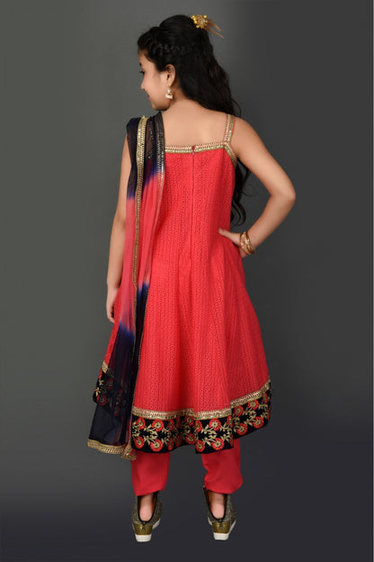 Peach Embroidered Net Kurta With Machine Work Detailing On The Front And Embroidered Border On The Hemline. Paired With Peach Pants And Peach Navy Blue Shaded Net Dupatta With Gold Edges.
